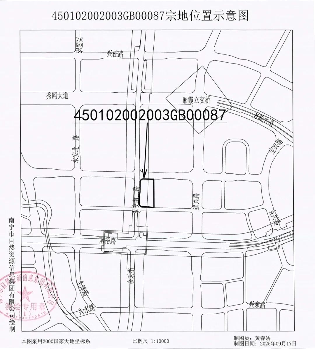 出让的GC2025-054地块位于兴宁区建兴路西侧、宝湾路南侧,宗地号为450102002003GB00087,实际出让面积为11124.23平方米(折合16.686亩),土地用途为城镇住宅、零售商业,土地使用年限为城镇住宅用地70年、零售商业用地40年。